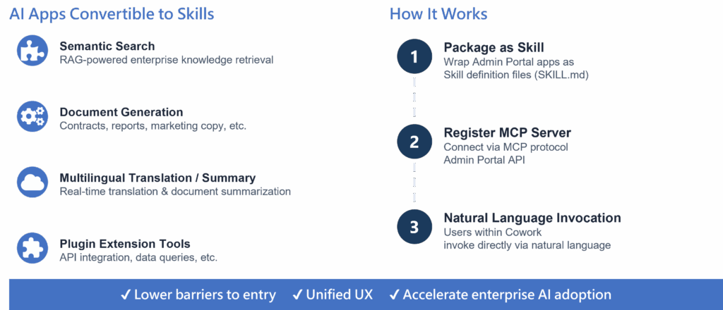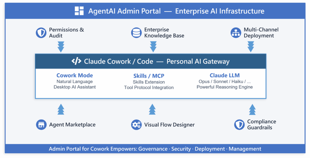 Claude + INTUMIT can handle autonomous agents by pulling data from ERP, CRM, and knowledge bases, trigger workflows, and execute multi-step tasks without manual intervention. Cowork serves as the gateway, while the AIAgent Admin Portal provides the enterprise foundation